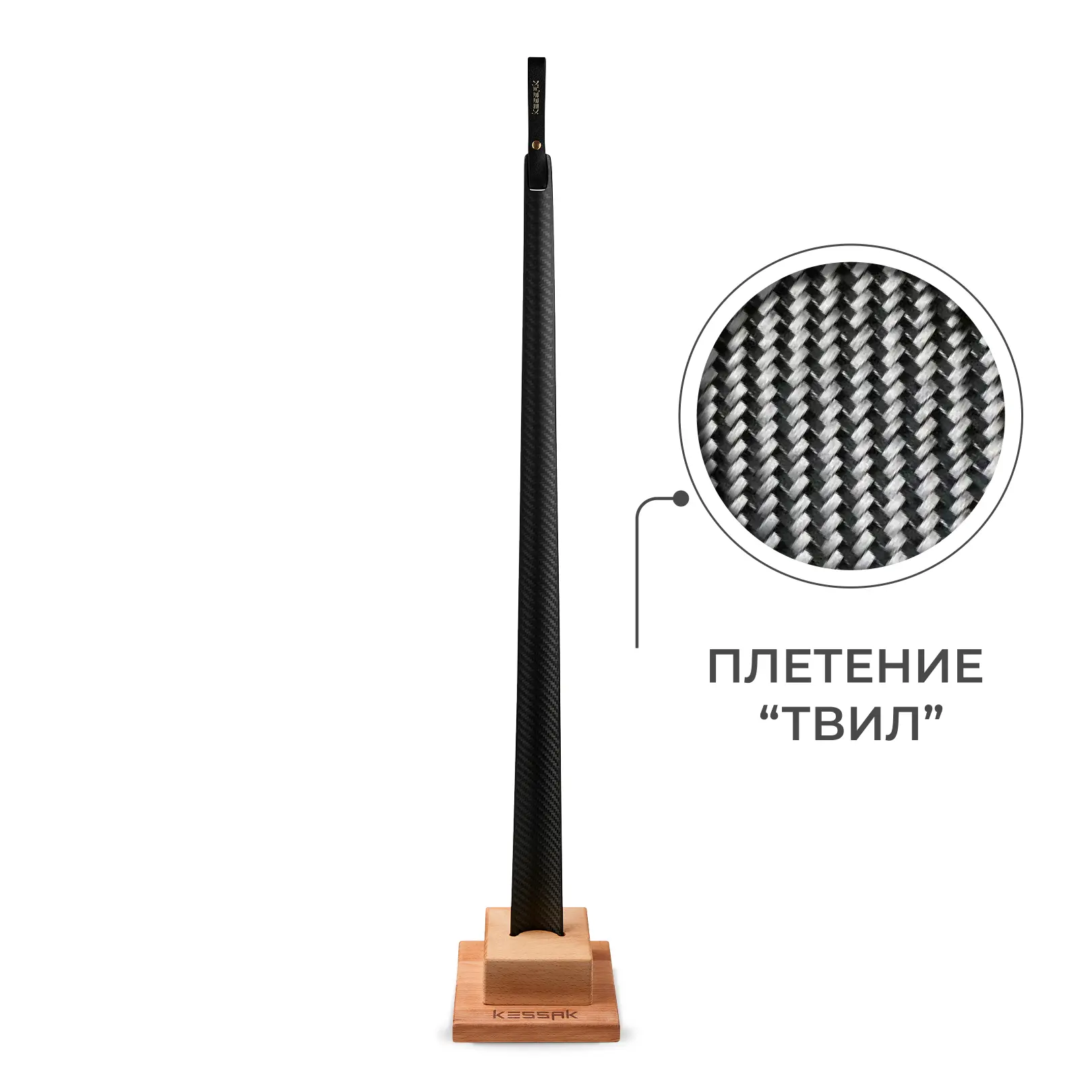 Практичность сочетается с эстетикой: изящное плетение углеродного волокна создаёт современный благородный облик изделия, а матовое покрытие не только подчёркивает его утончённый вид, но и служит дополнительной защитой от мелких повреждений и царапин. Для удобства хранения ложка оснащена элегантной петелькой из натуральной кожи. С её помощью ложку можно повесить на стену в прихожей или аккуратно убрать в шкаф, чтобы всегда иметь под рукой. В подарок мы также добавляем тиснение с инициалами на петельке.