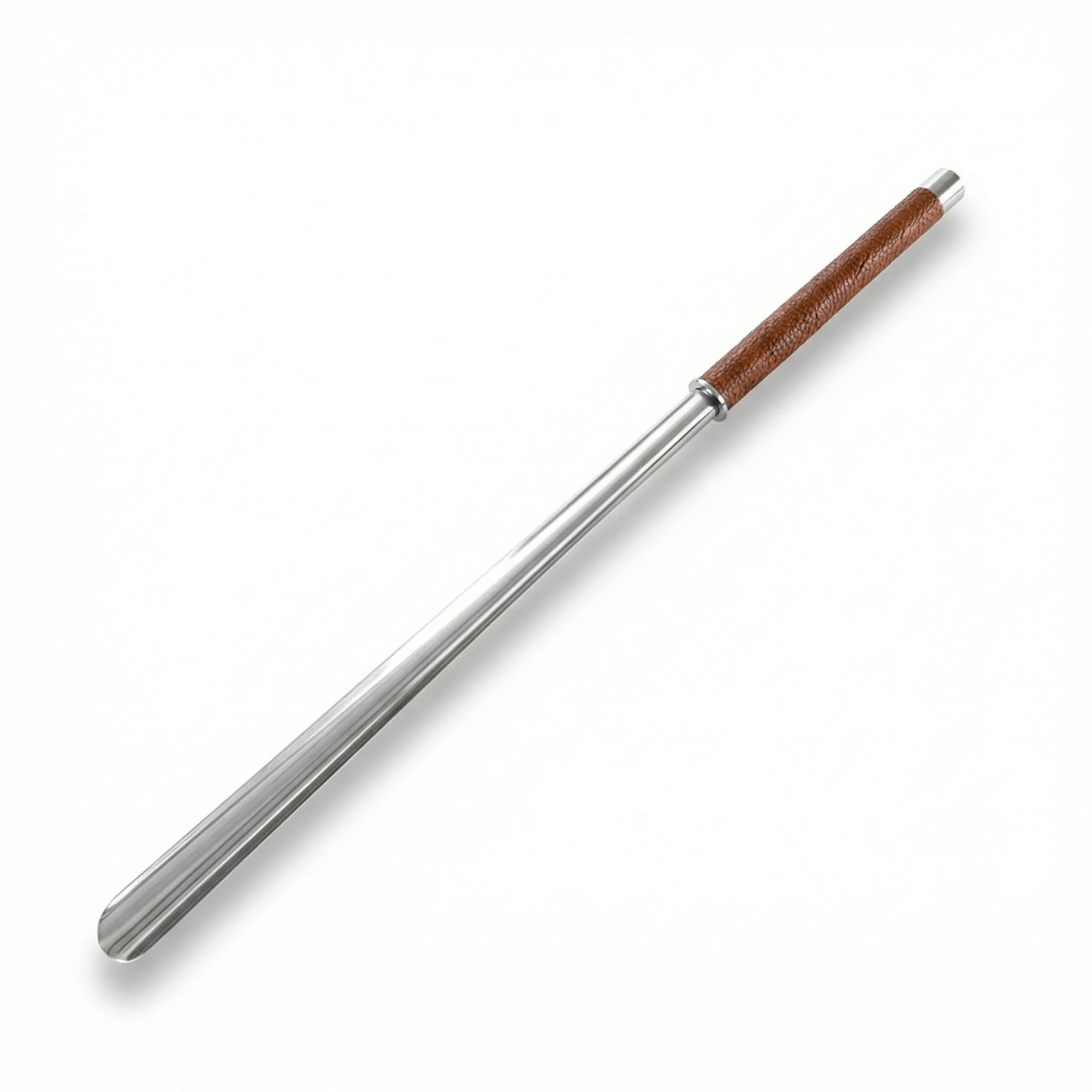 Эта ложка создана вручную, отличается высоким качеством и уникальным дизайном. Её вес составляет 770 граммов, а длина — 88 сантиметров, что позволяет легко надевать обувь, не наклоняясь. Для придания оригинальности мы можем нанести гравировку на верхушку меча.