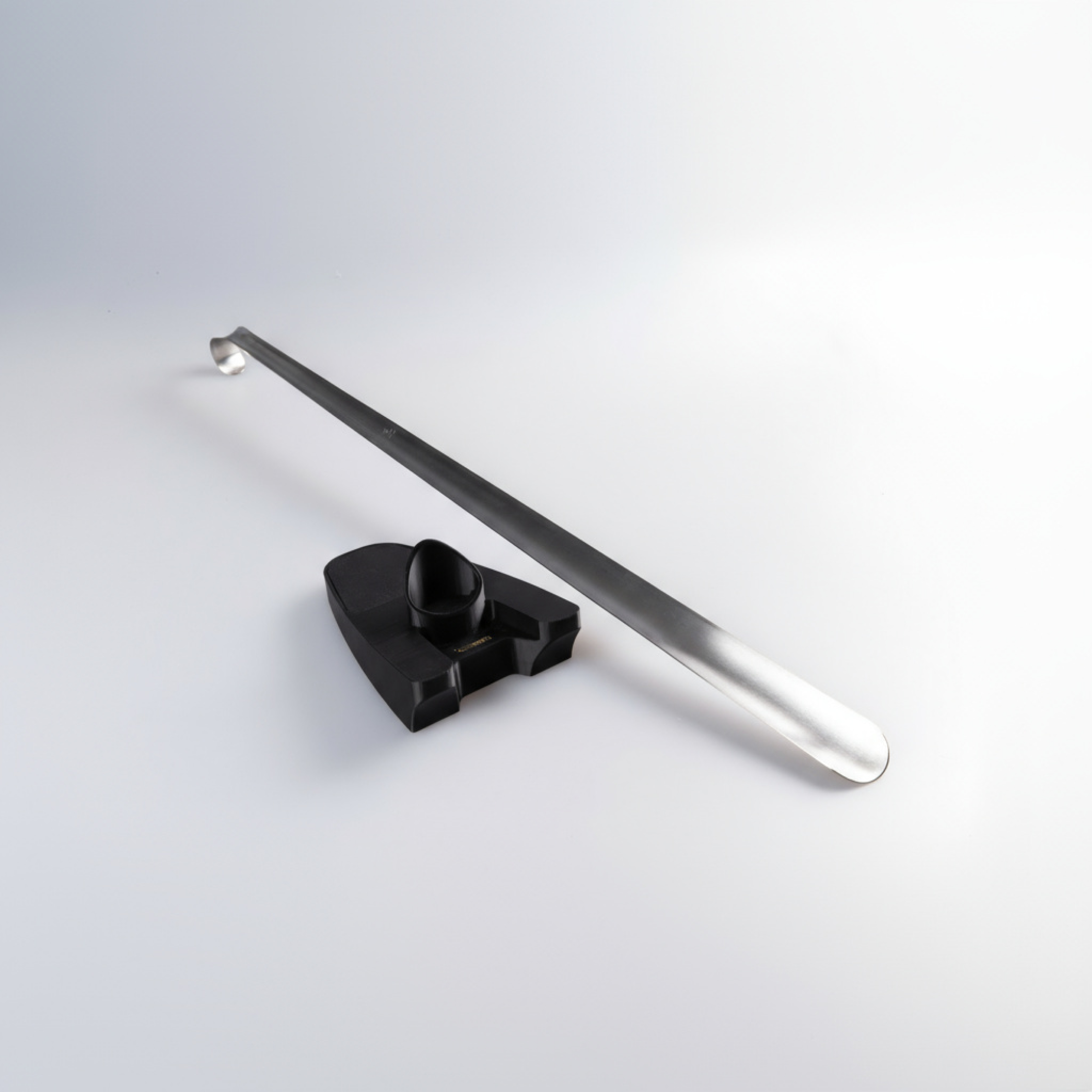 Длина ложки составляет 78 сантиметров, вес 300 грамм. Стильная лаконичная подставка выполнена из ABS Plastik с металлическим утяжелителем внутри. Подставка является стильным и функциональным дополнением к обувной ложки. Длина подставки 20 сантиметров, ширина 14 сантиметров. Удобное и эстетичное хранение обувного меча в интерьере. Общая высота набора — 80 сантиметров, что делает его солидным и стильным элементом интерьера.