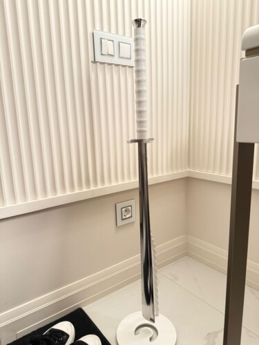 Длина ложки 88 сантиметров. Обувная ложка Kessак изготовлена из высококачественной стали толщиной 1,5 мм. Рельефная рукоять с матовым рисунком придаёт ложке особую изысканность, а подставка круглой формы дополняет общую композицию. Диаметр подставки 19 сантиметров. Высота подставки и обувной ложки составляет 92 сантиметра.